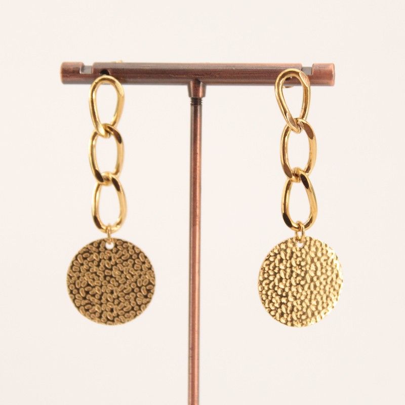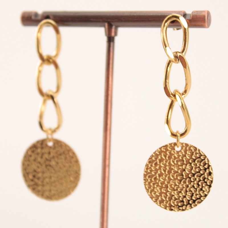 Se trata de unos pendientes hechos de acero inoxidable con un baño de oro de 18k. Los pendientes miden 5 cm de largo i 2 cm de ancho y tienen como método de cierre el cierre a presión.